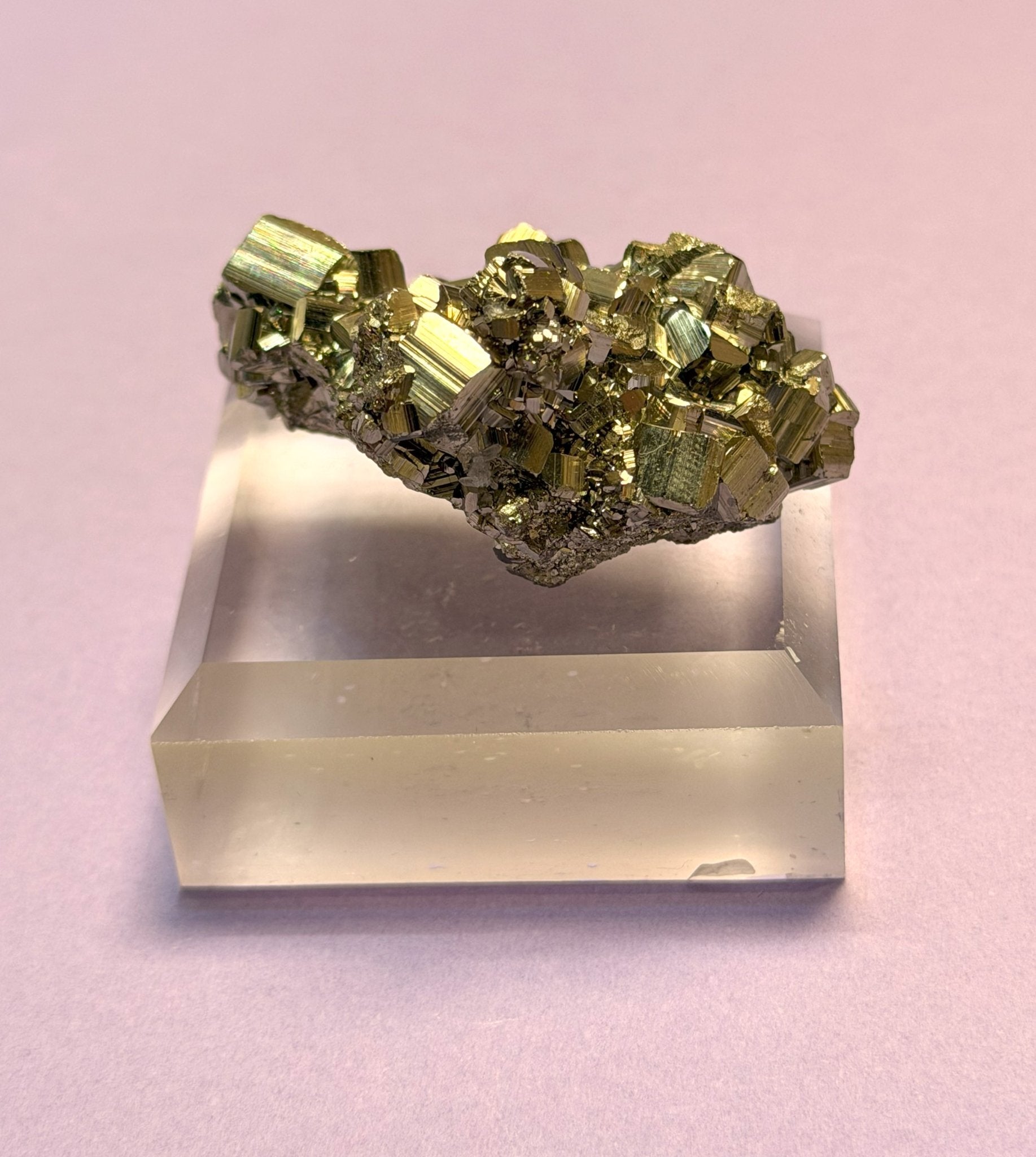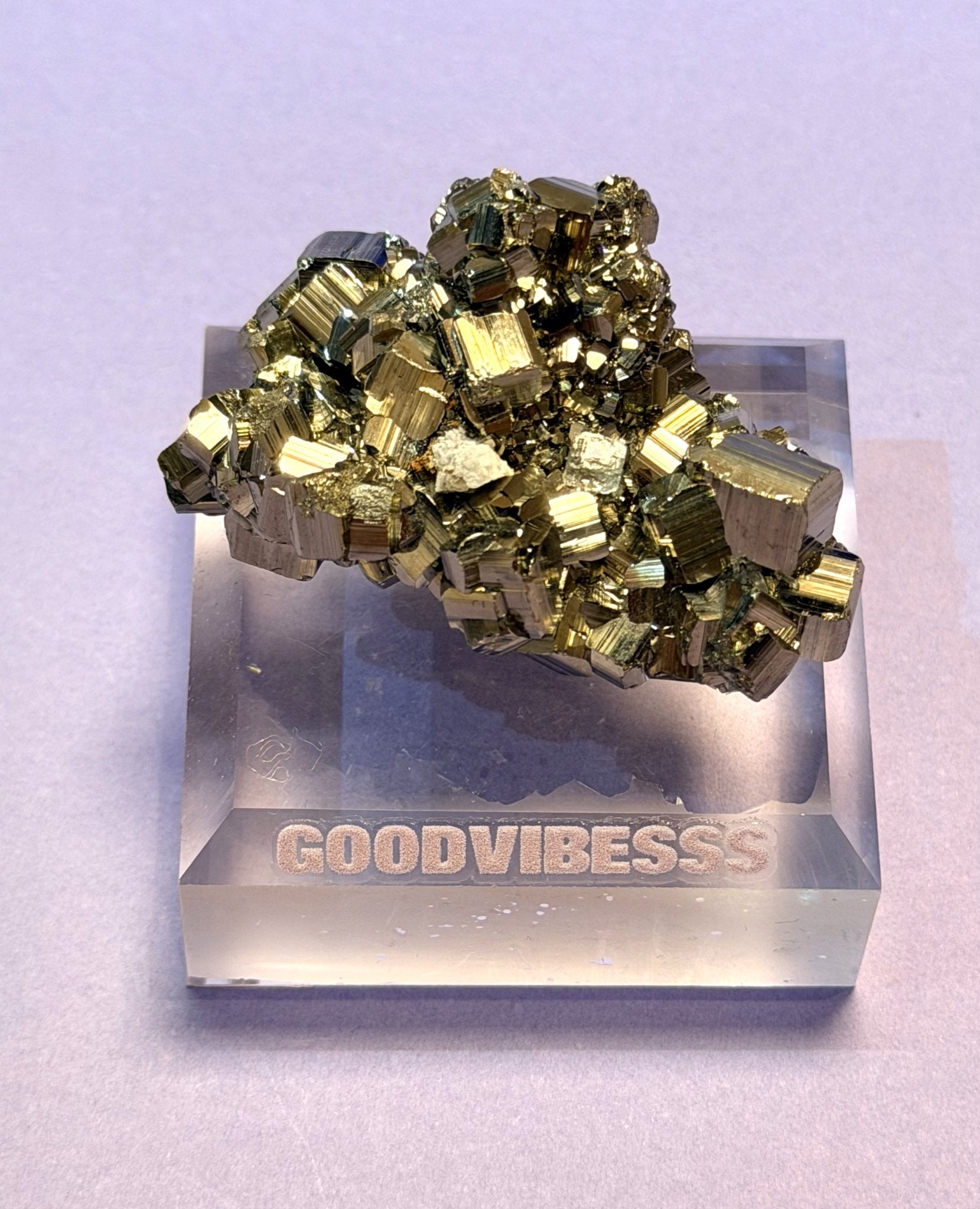 Pyrite doesn't just catch light - it commands it. Each geometric cube forms with mathematical precision, nature's own architecture. Mounted on a custom clear acrylic stand engraved with GOODVIBESSS.