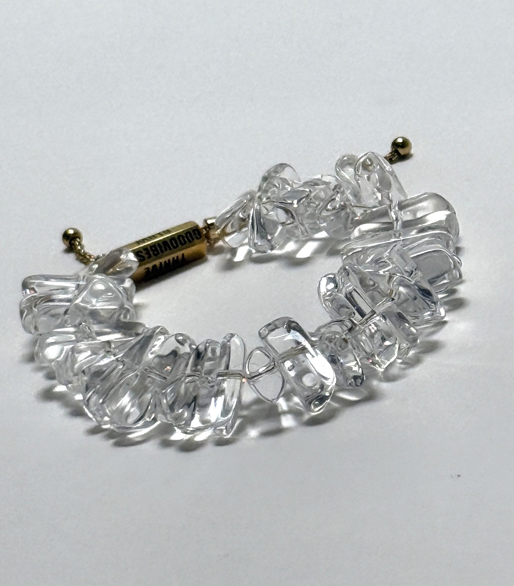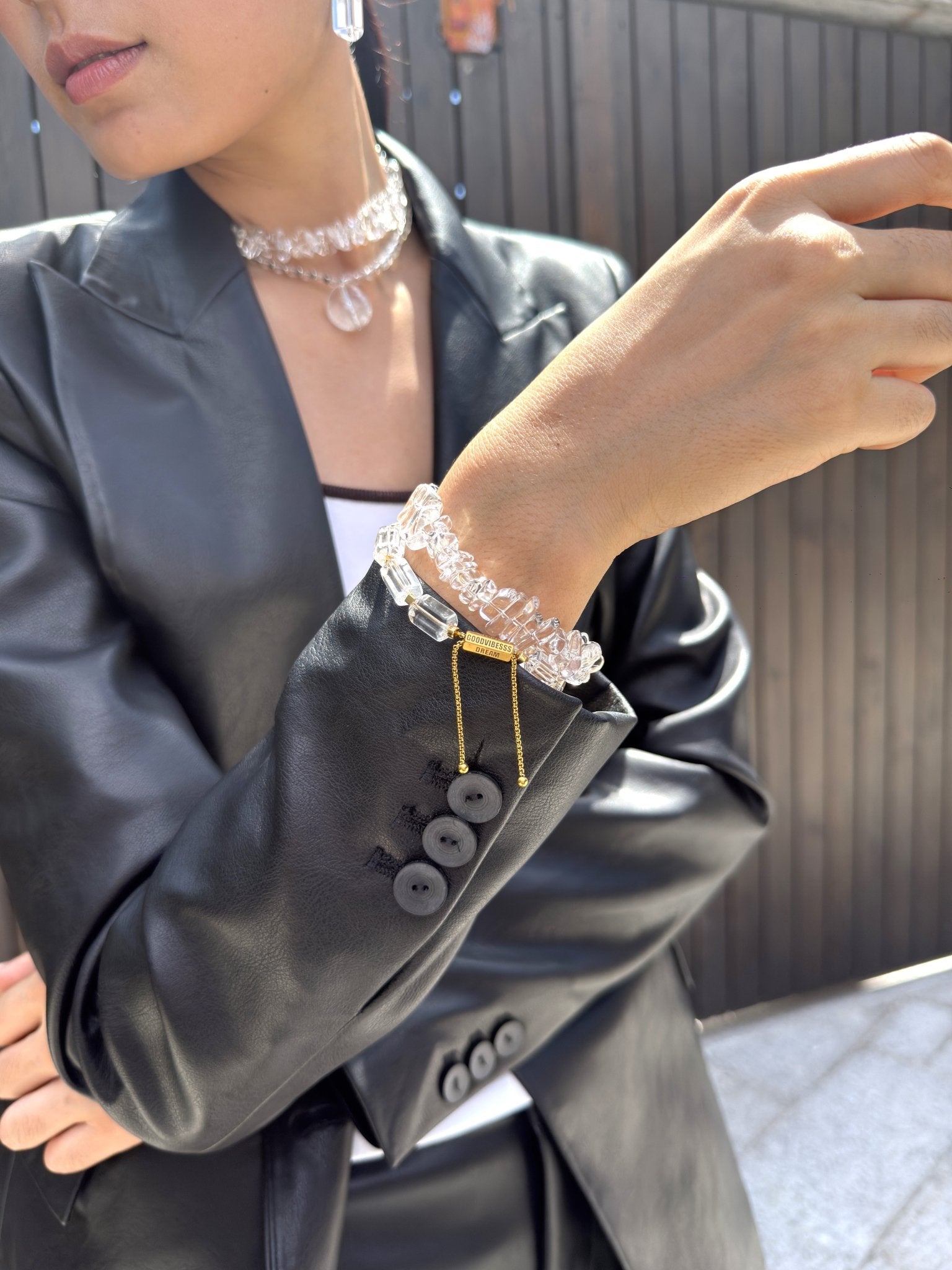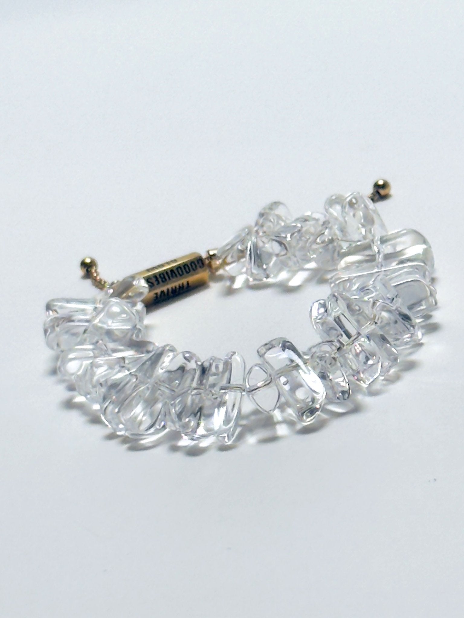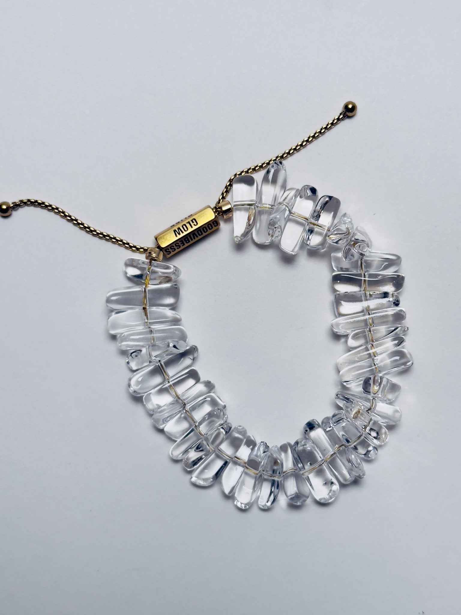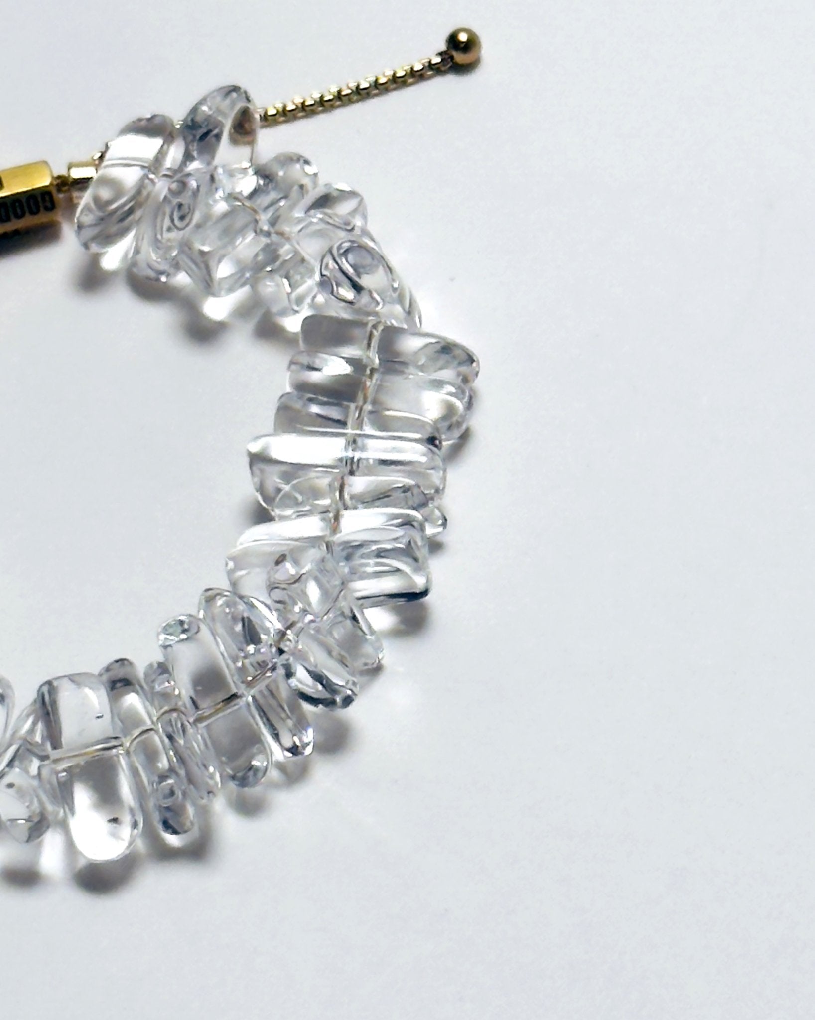 Type: Bracelet | Crystals: Brazilian Clear Quartz nuggets | Hardware: Slider clasp with mantra dipped in 18K gold bath | Attuned: Yes