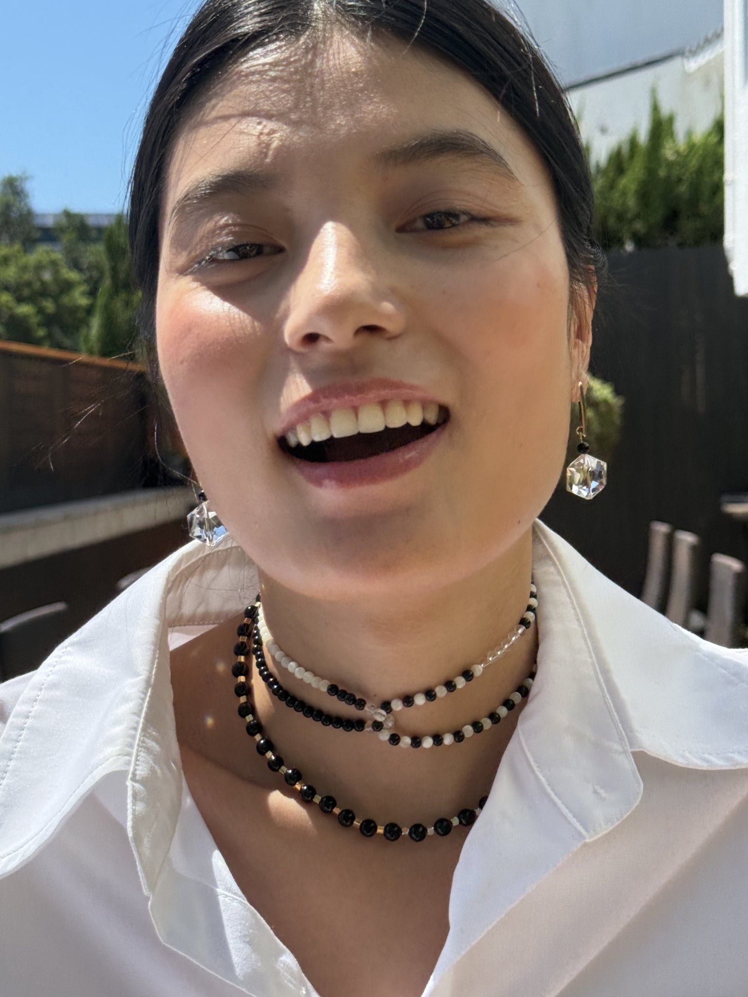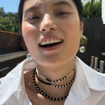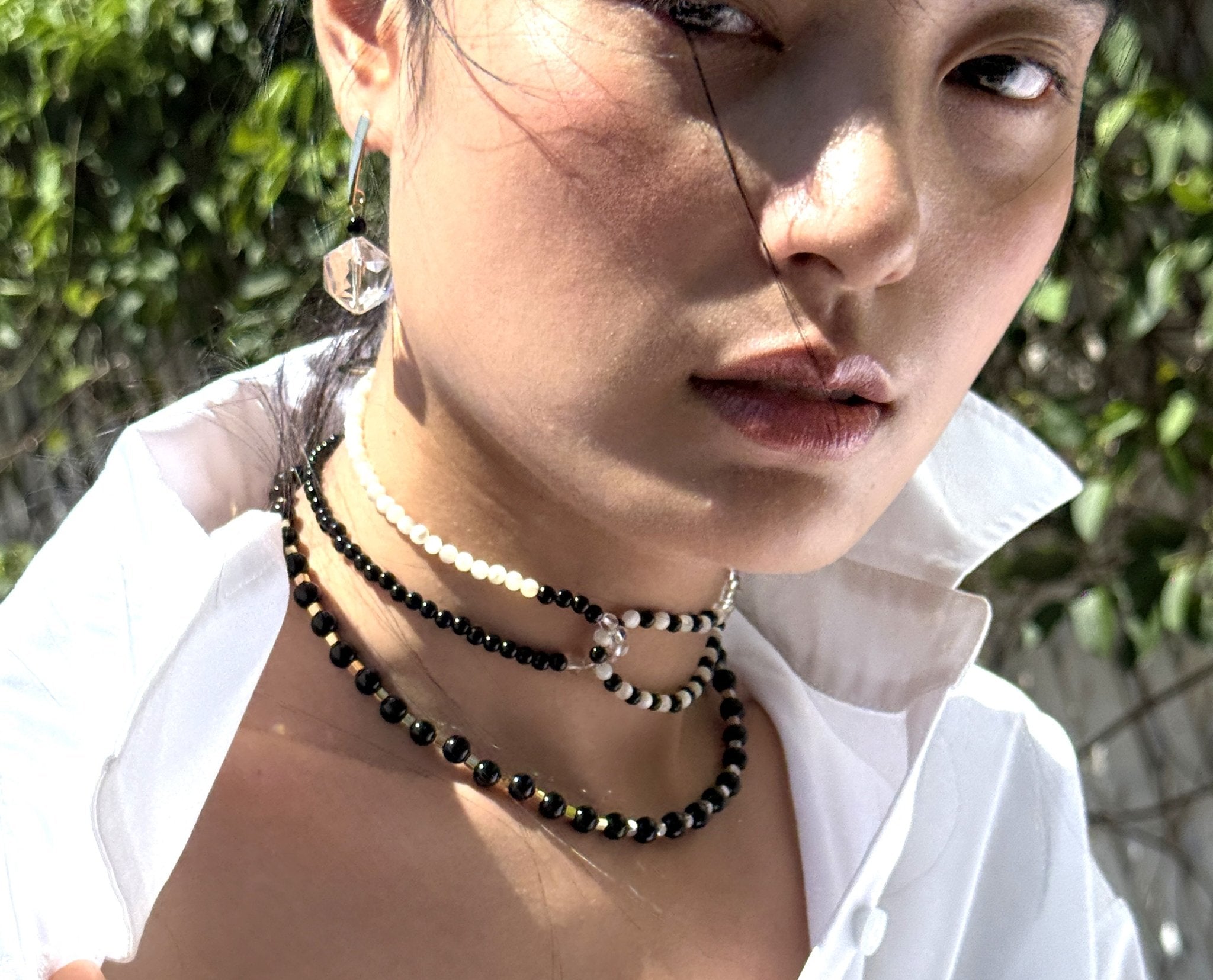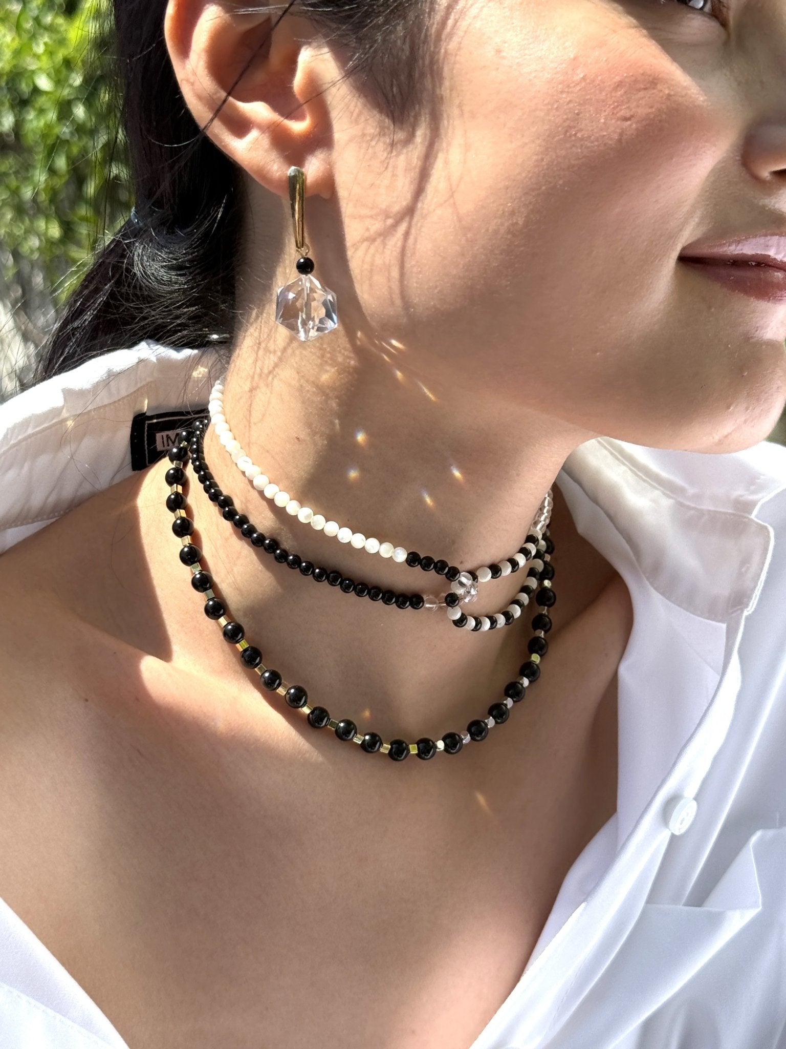 Brazilian clear quartz prisms catch light and amplify your intention with every turn of your head. Black agate keeps you centered and protected when the world gets loud. Together?