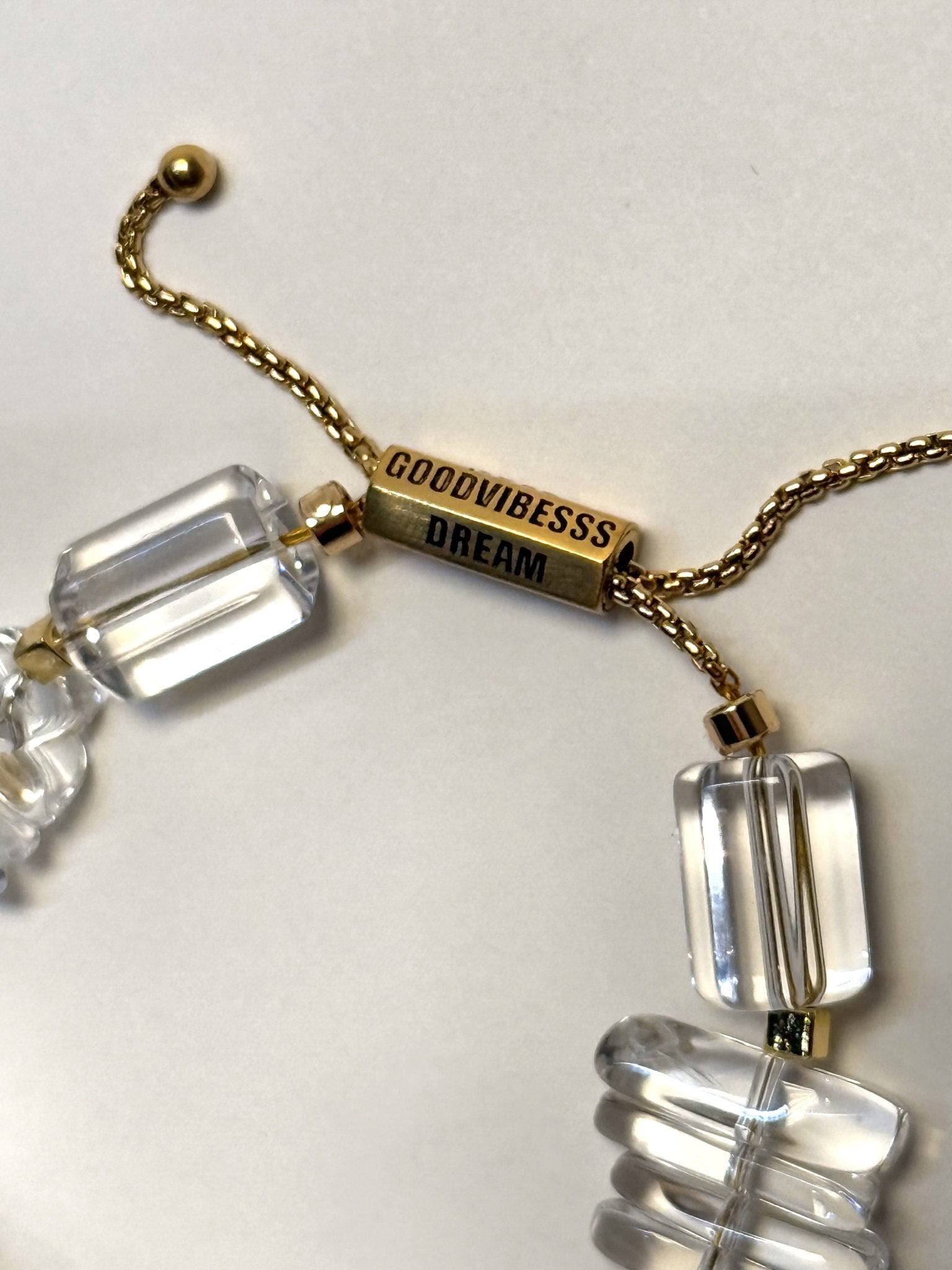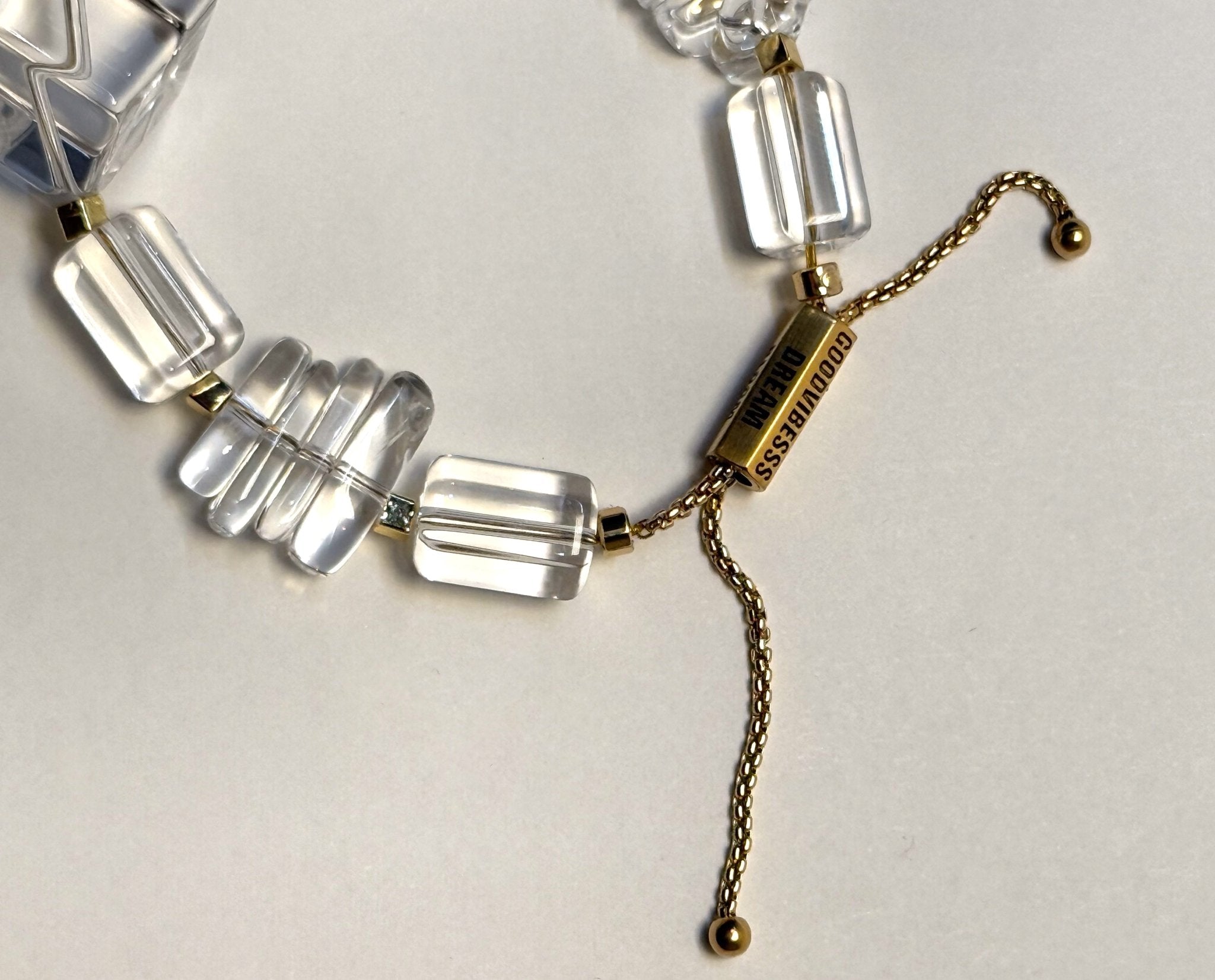 Type: Bracelet | Crystals: Brazilian Mixed Cuts Clear Quartz | Hardware: Slider clasp with mantra dipped in 18K gold bath | Attuned: Yes