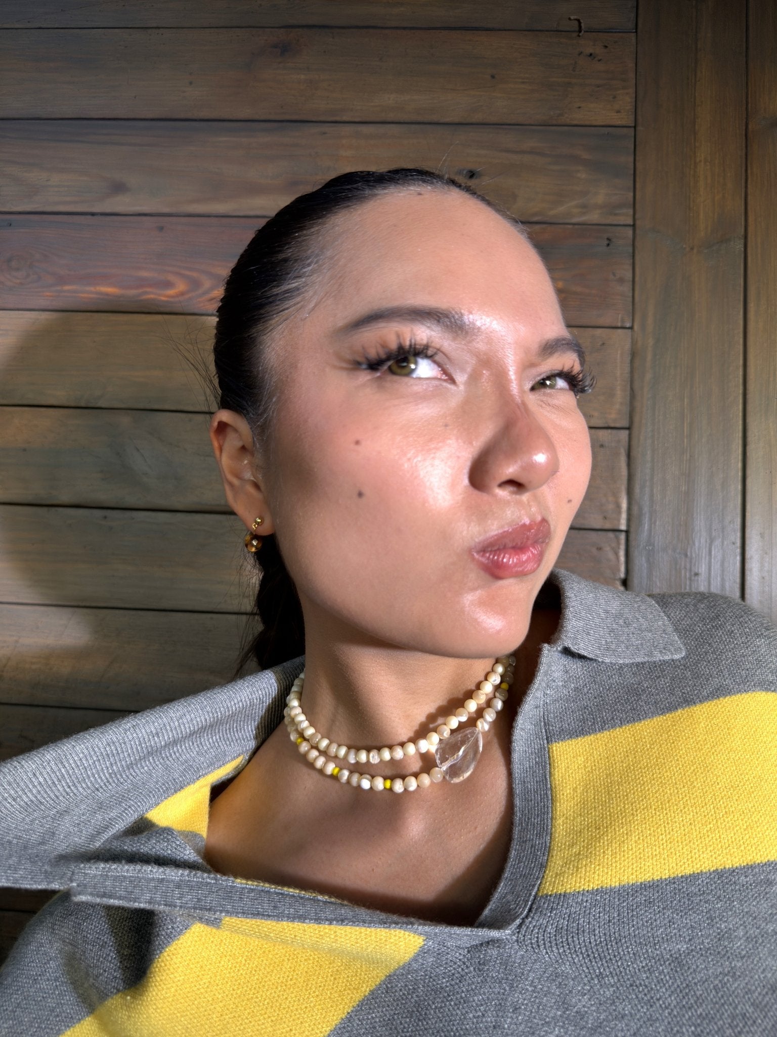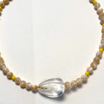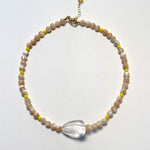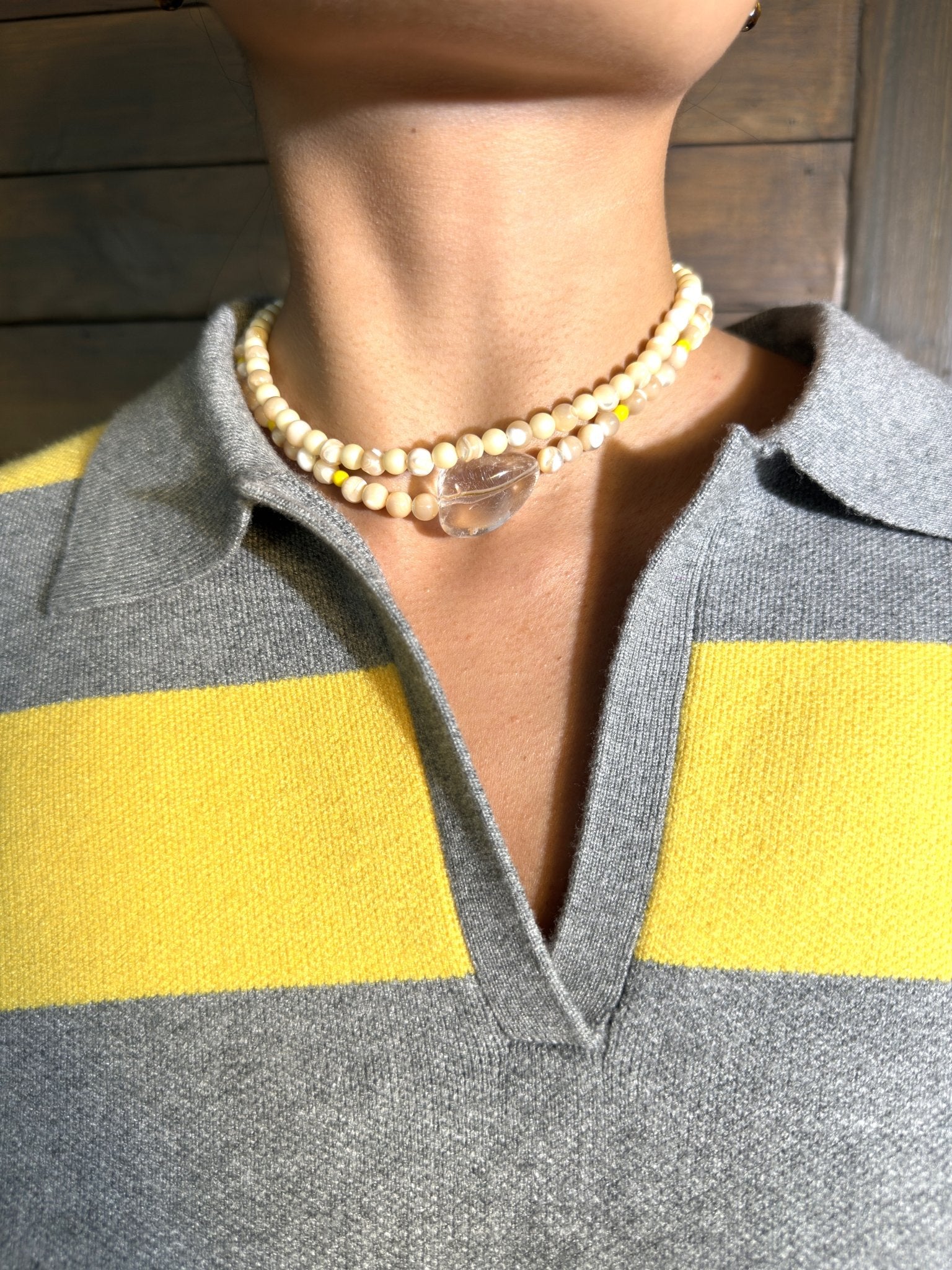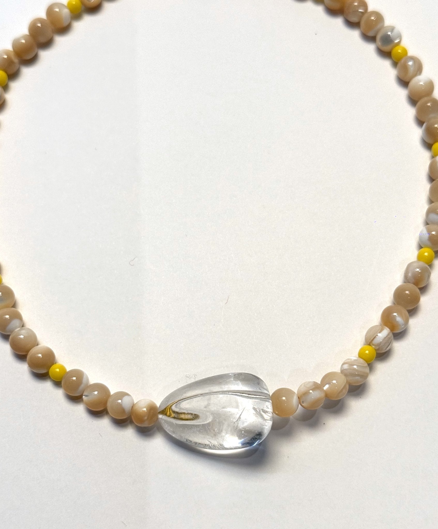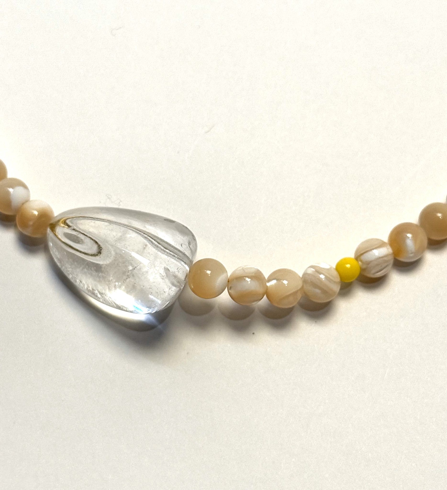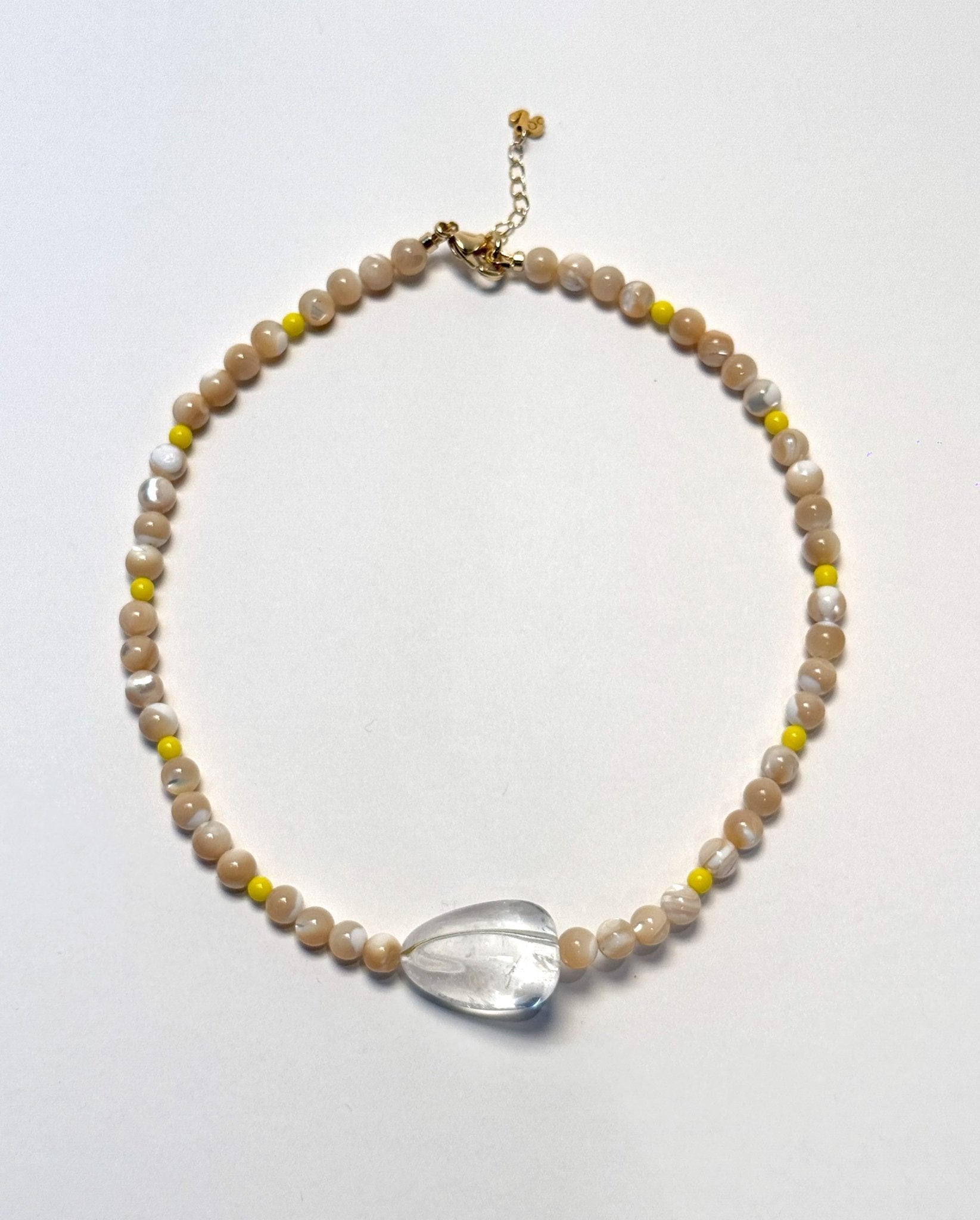 Type: Necklace | Crystals: Round Sphere Brown Lip MOP & Brazilian Polished Varied Oval Milky Quartz | Hardware: Lobster clasp dipped in 18K gold bath with extension chain (5cm) | Attuned: Yes