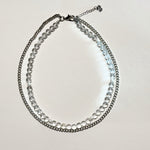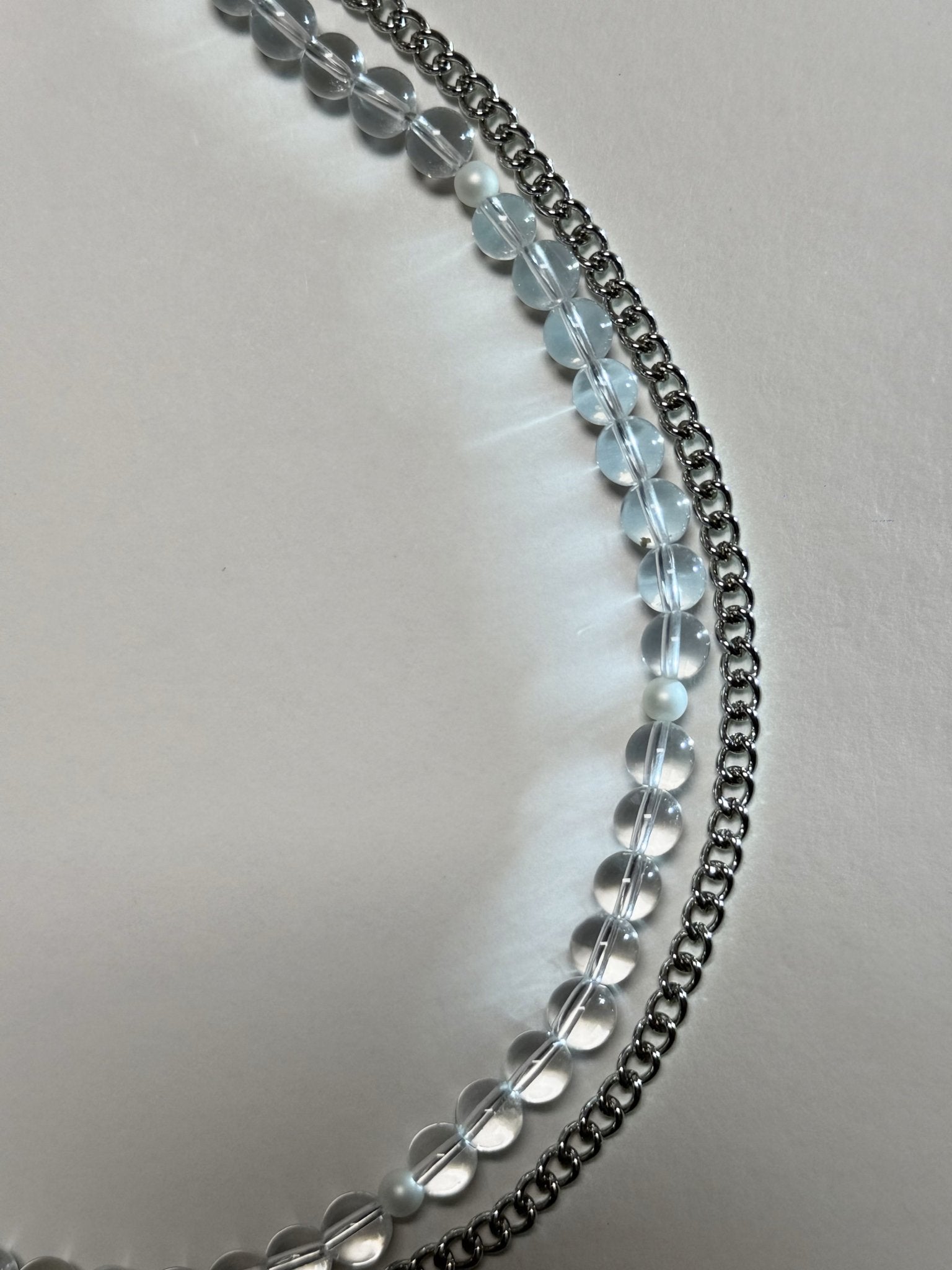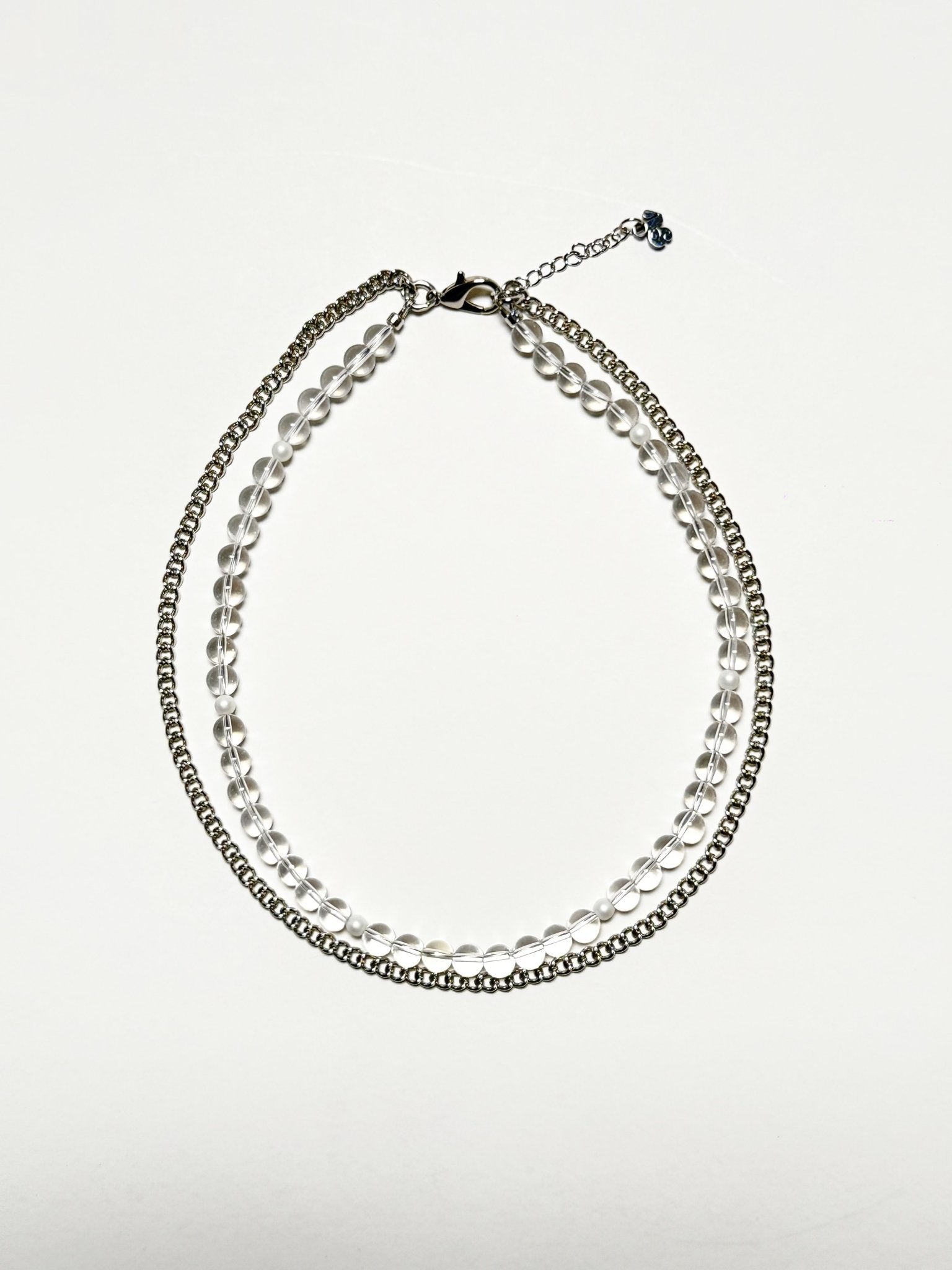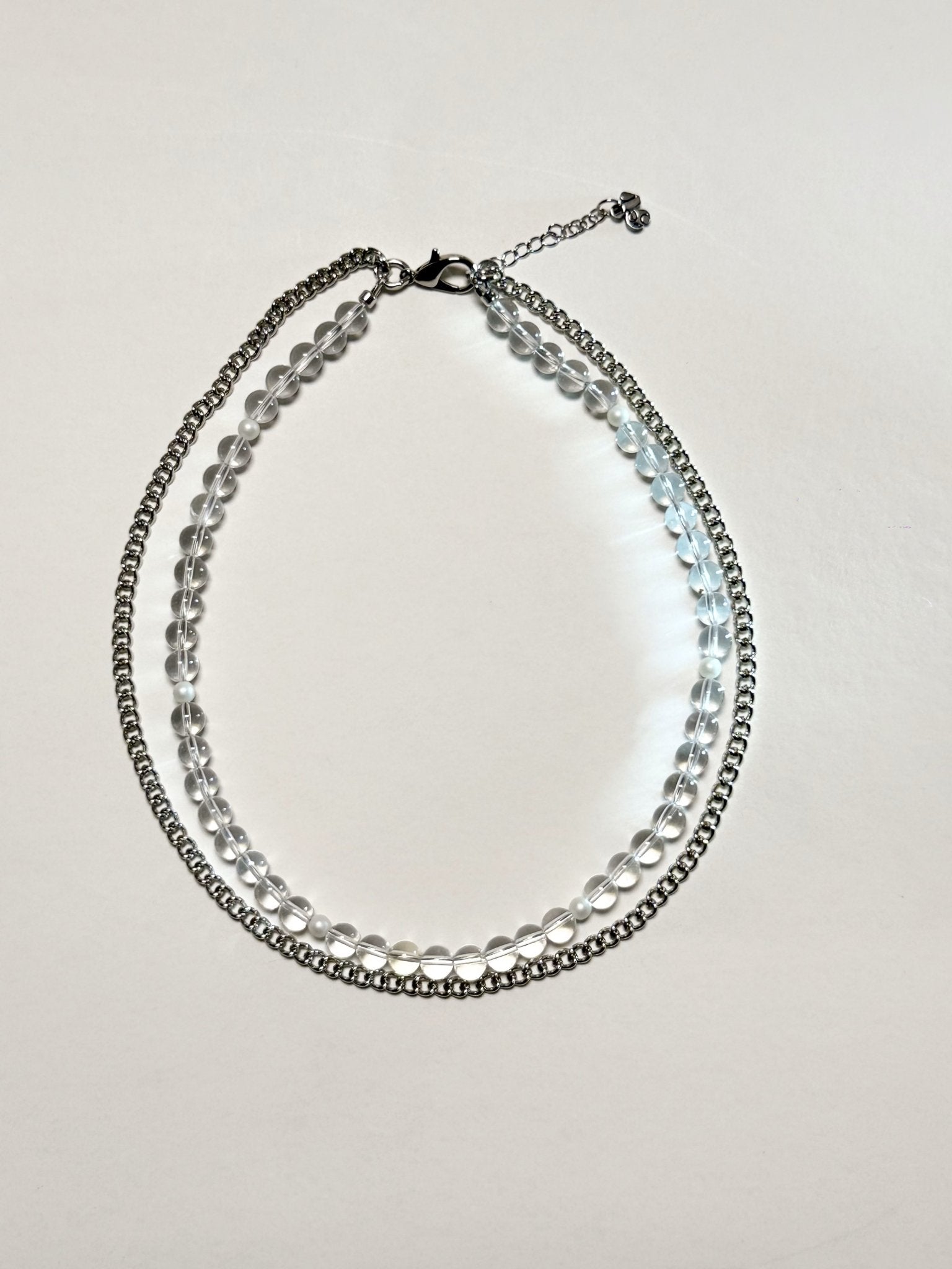 Brazilian clear quartz spheres catch light like captured starlight. Japanese matte white pearls interrupt the flow with quiet elegance - a reminder that pauses matter. Silver chain grounds it all. Layered or solo, this necklace whispers power.