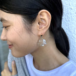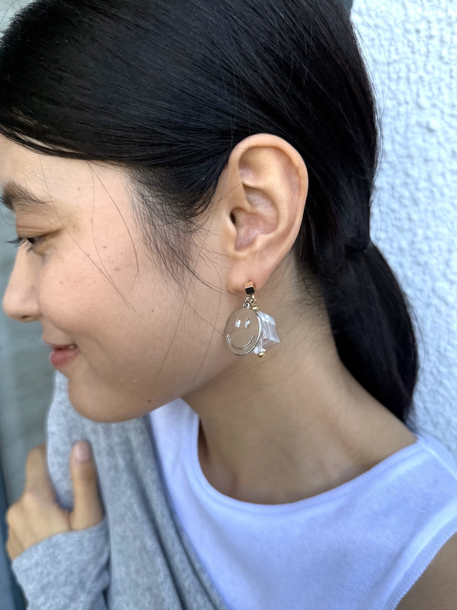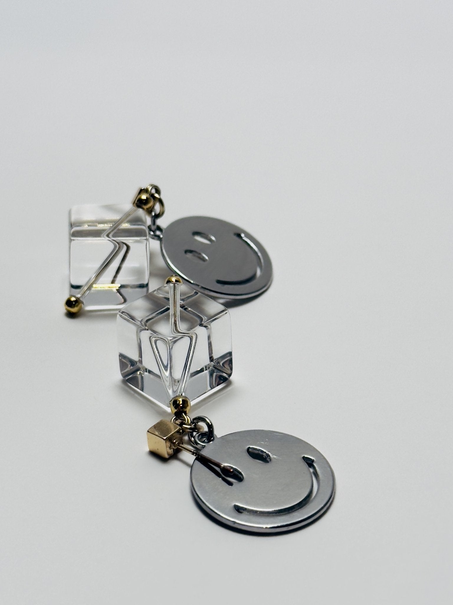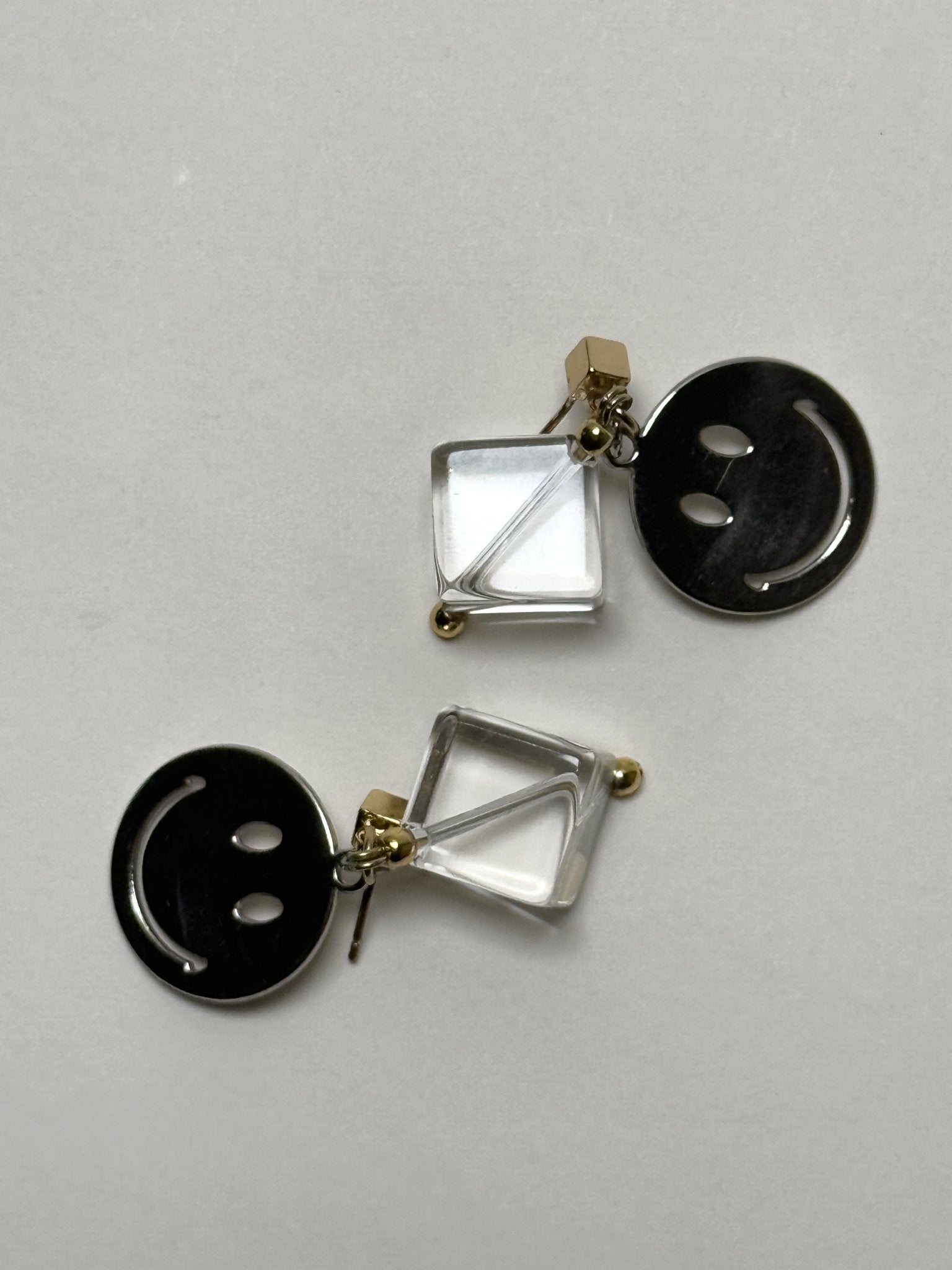 Type: Earrings | Crystals: Brazilian Cushioned cut Clear Quartz | Hardware: Ear hooks and smiley face charm dipped in silver bath | Attuned: Yes