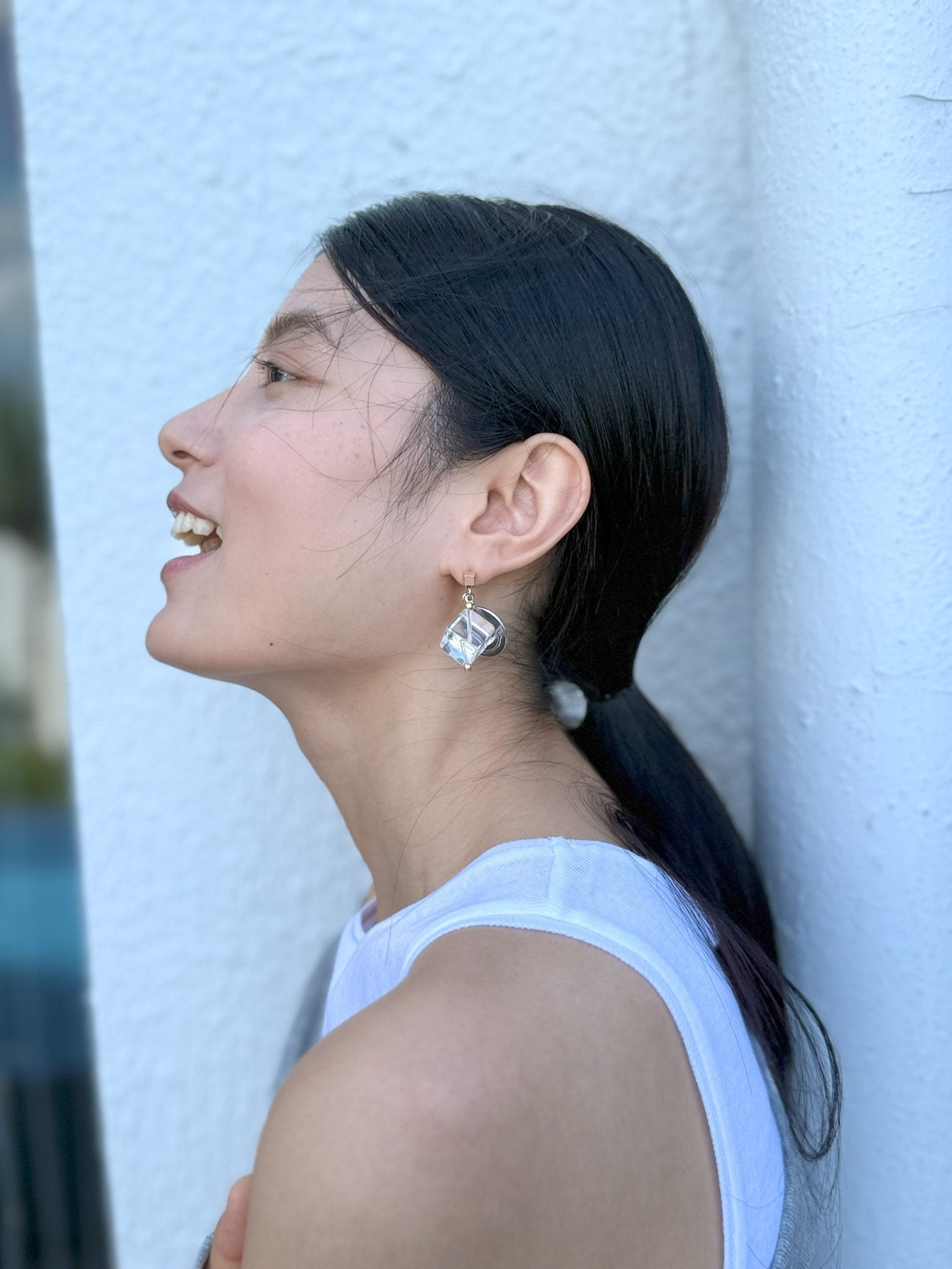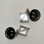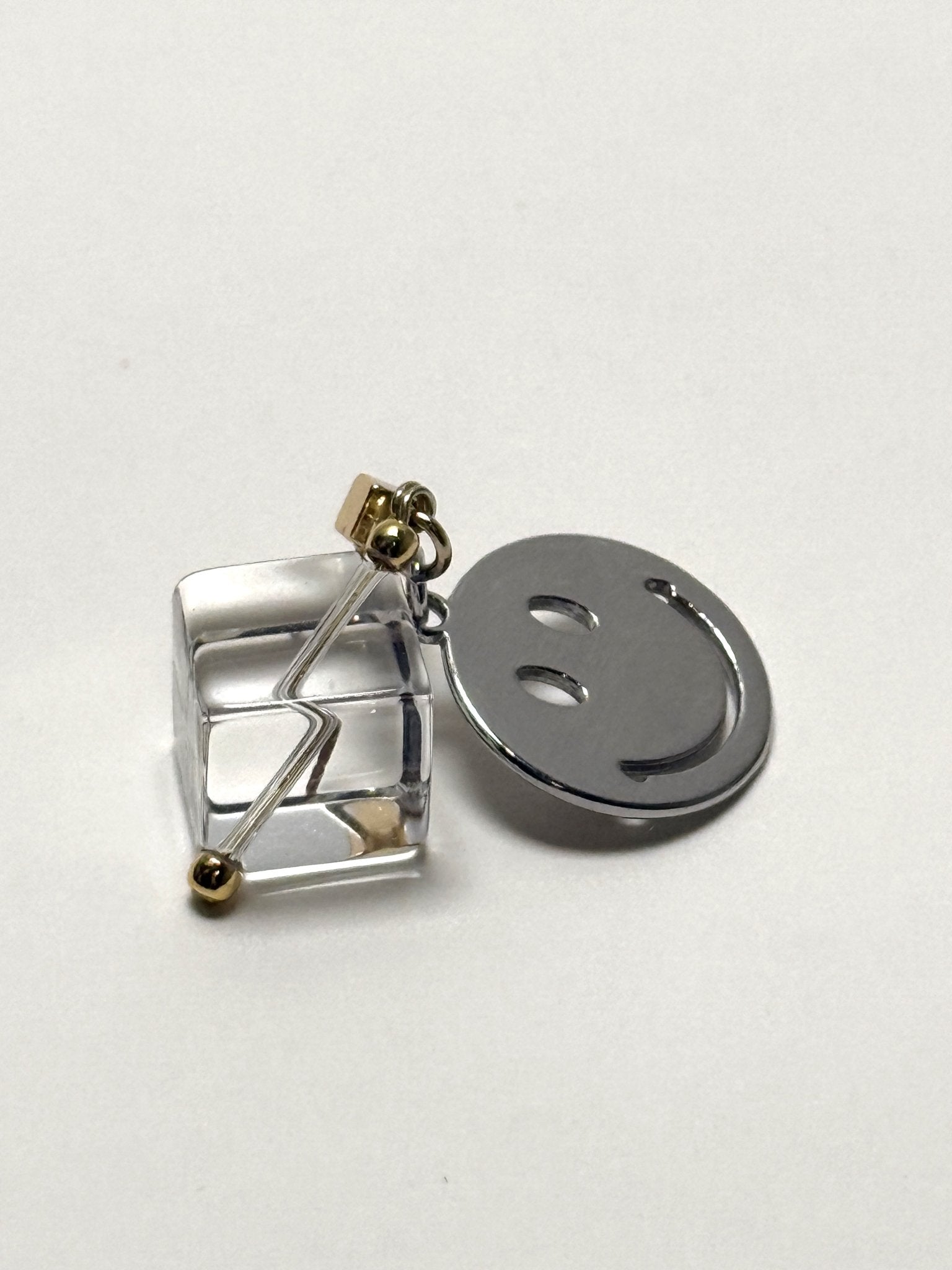 The GEOMETRICAL CUT - Brazilian Cushioned cut Clear Quartz on silver smiley face charm and earring hook.